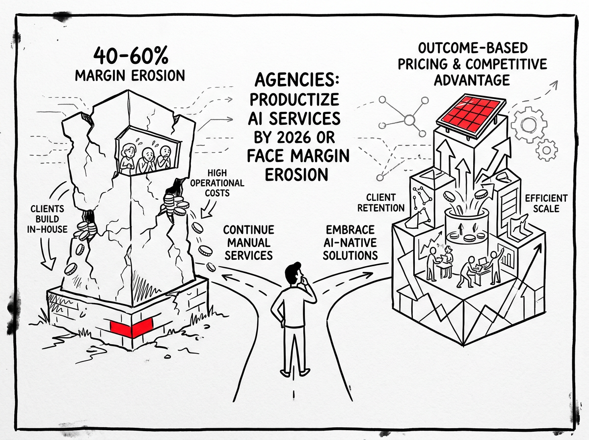 Agencies that fail to productize AI services within 2026 face a 40–60% margin erosion as clients either build in-house or switch to AI-native competitors offering outcome-based pricing.