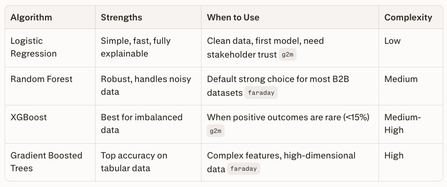 For teams without data science resources, start simple. Logistic regression is fast, explainable, and performs well when the dataset is clean and the use case is narrow. Random Forest is the next step up — robust, accurate, and handles messy data better than logistic regression. XGBoost and Gradient Boosted Trees deliver top accuracy on complex tabular data but require more tuning.