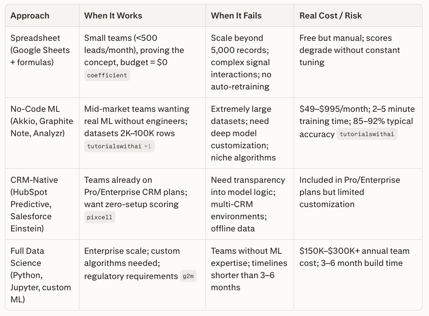 Traditional lead scoring assigns fixed points manually (e.g., +10 for webinar attendance). Propensity modeling uses algorithms to learn which signals actually predict conversions and dynamically weights them. HubSpot Predictive Scoring (Enterprise plan) and Salesforce Einstein bridge the gap by applying ML within the CRM, but they offer less transparency and customization than dedicated platforms.
