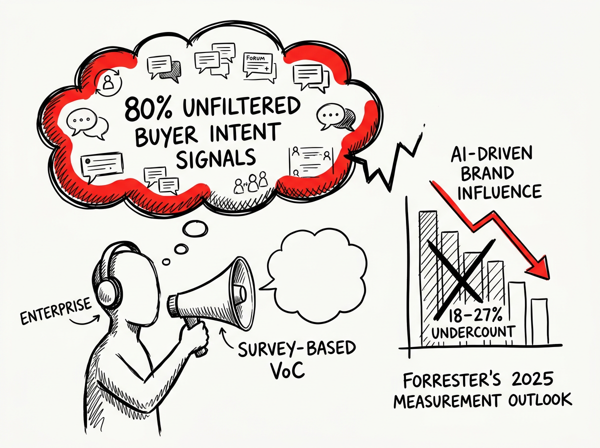 Enterprises relying on traditional survey-based Voice of Customer programs miss 80% of unfiltered buyer intent signals now embedded in community discussions—costing an estimated 18–27% undercount in AI-driven brand influence, according to Forrester's 2025 Measurement Outlook.