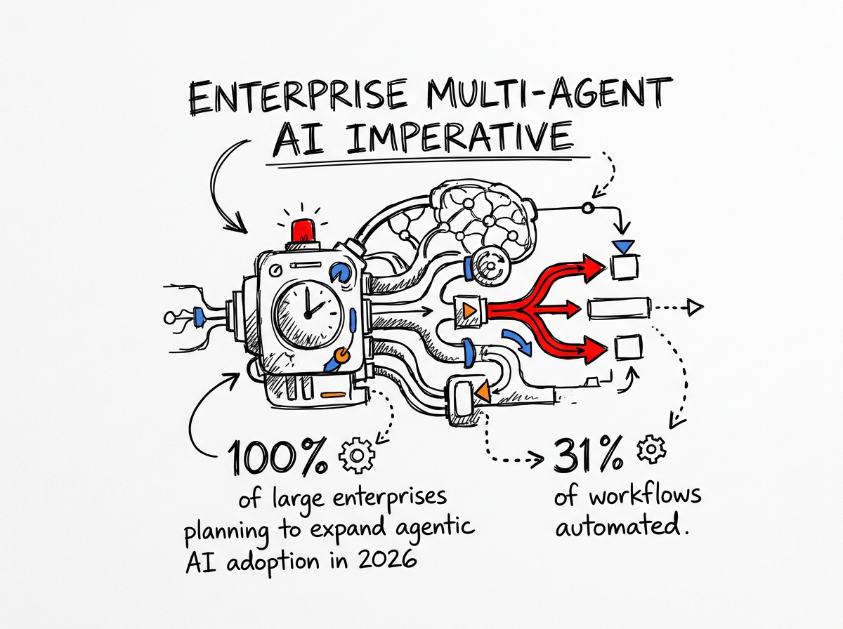 Multi-agent AI has moved from experiment to enterprise imperative: 100% of surveyed large enterprises plan to expand agentic AI adoption in 2026, and organizations have already automated 31% of their workflows.