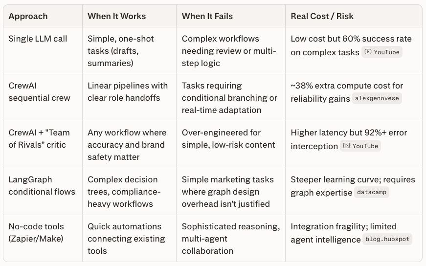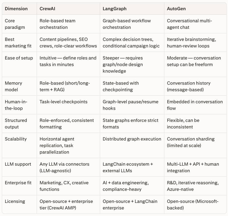 For marketing teams starting with multi-agent AI, CrewAI is the lowest-friction entry point. Its role metaphor maps directly onto how marketing teams already think — researcher, strategist, writer, editor. LangGraph becomes the better choice when campaign logic branches conditionally (e.g., different content paths by audience segment). AutoGen fits best when a human editor needs to stay conversationally inside the loop.